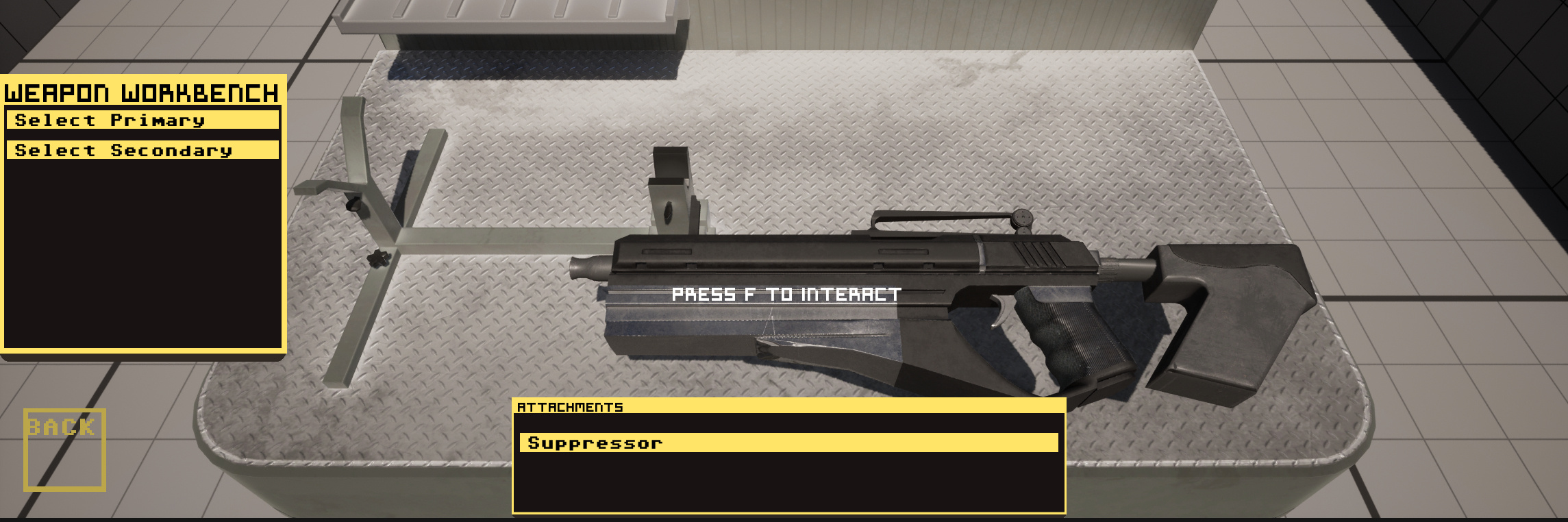 For the attachment system we had in mind to have a Suppressor, Extended Mag and a Grip but only managed to release a Suppressor due to not having full models for the other attachments. The attachments use a simple socket system provided by Unreal which then just modified the values of the weapon you currently held. The idea of the attachment system workbench was similar to Call of Duty with displaying the gun and having the attachments visibly on the weapon.